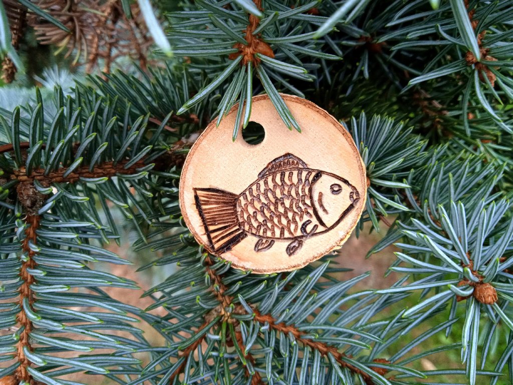 Dřevěná Vánoční ozdoba kapříka vyrobena technikou pyrografie.
